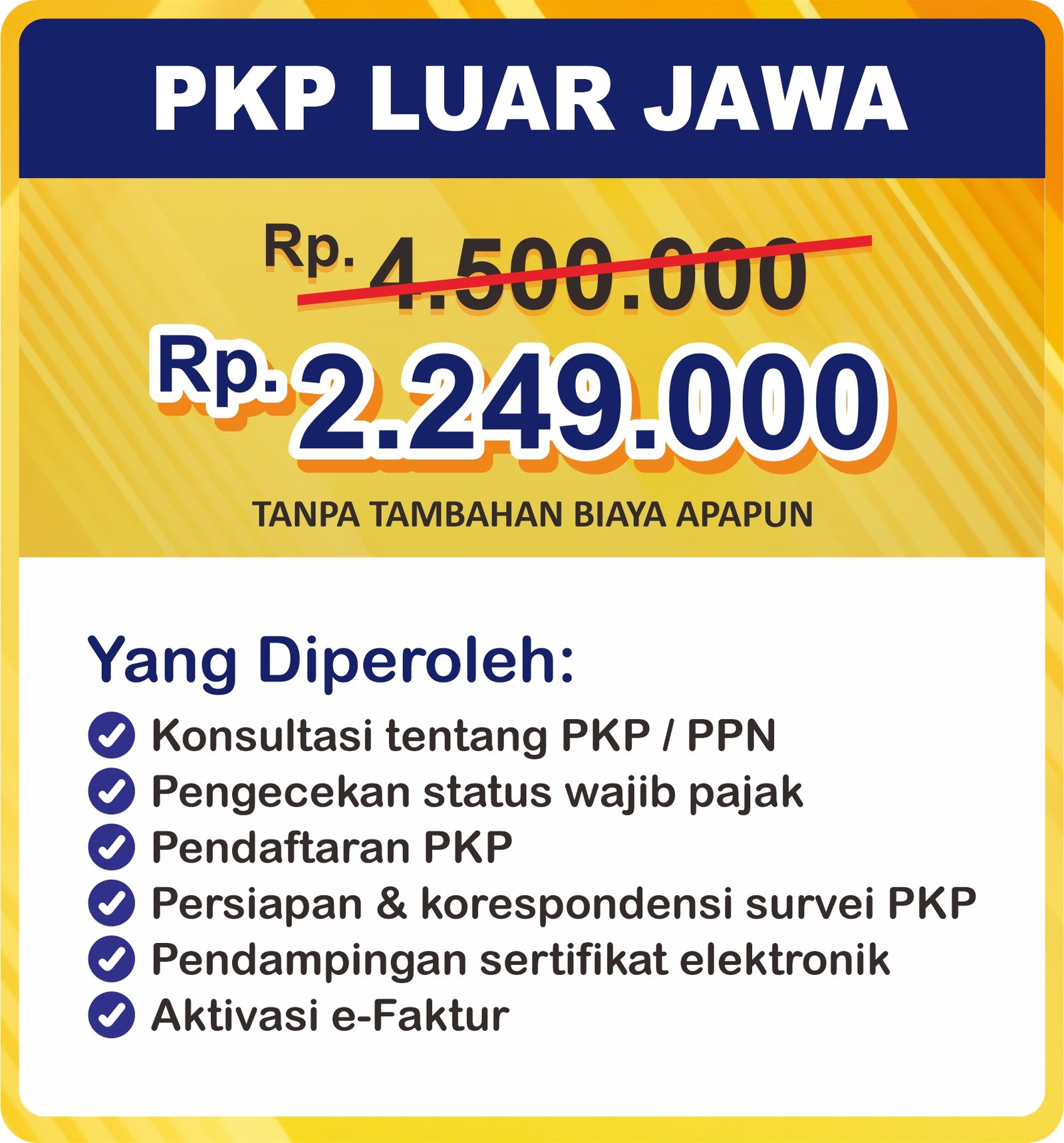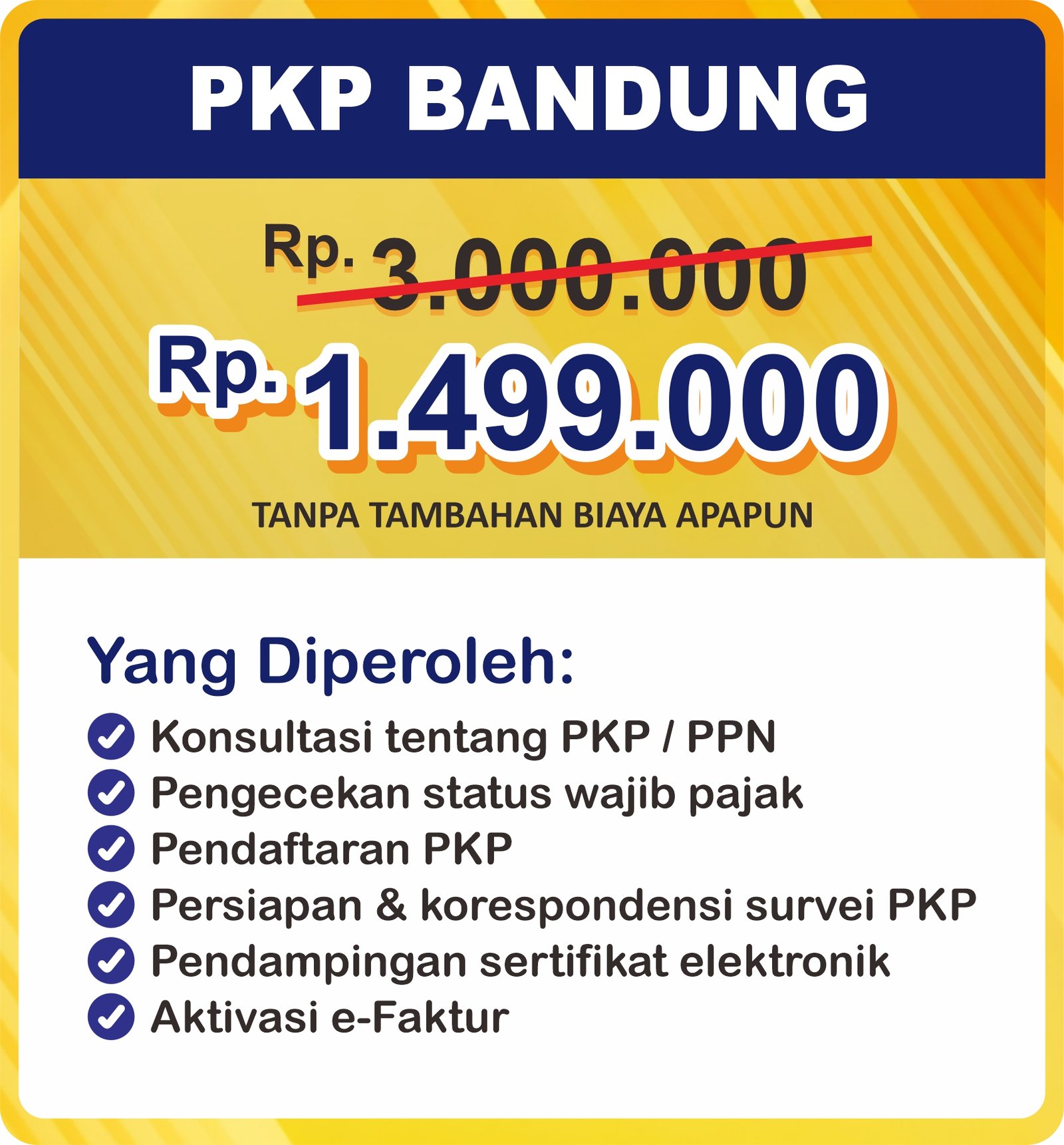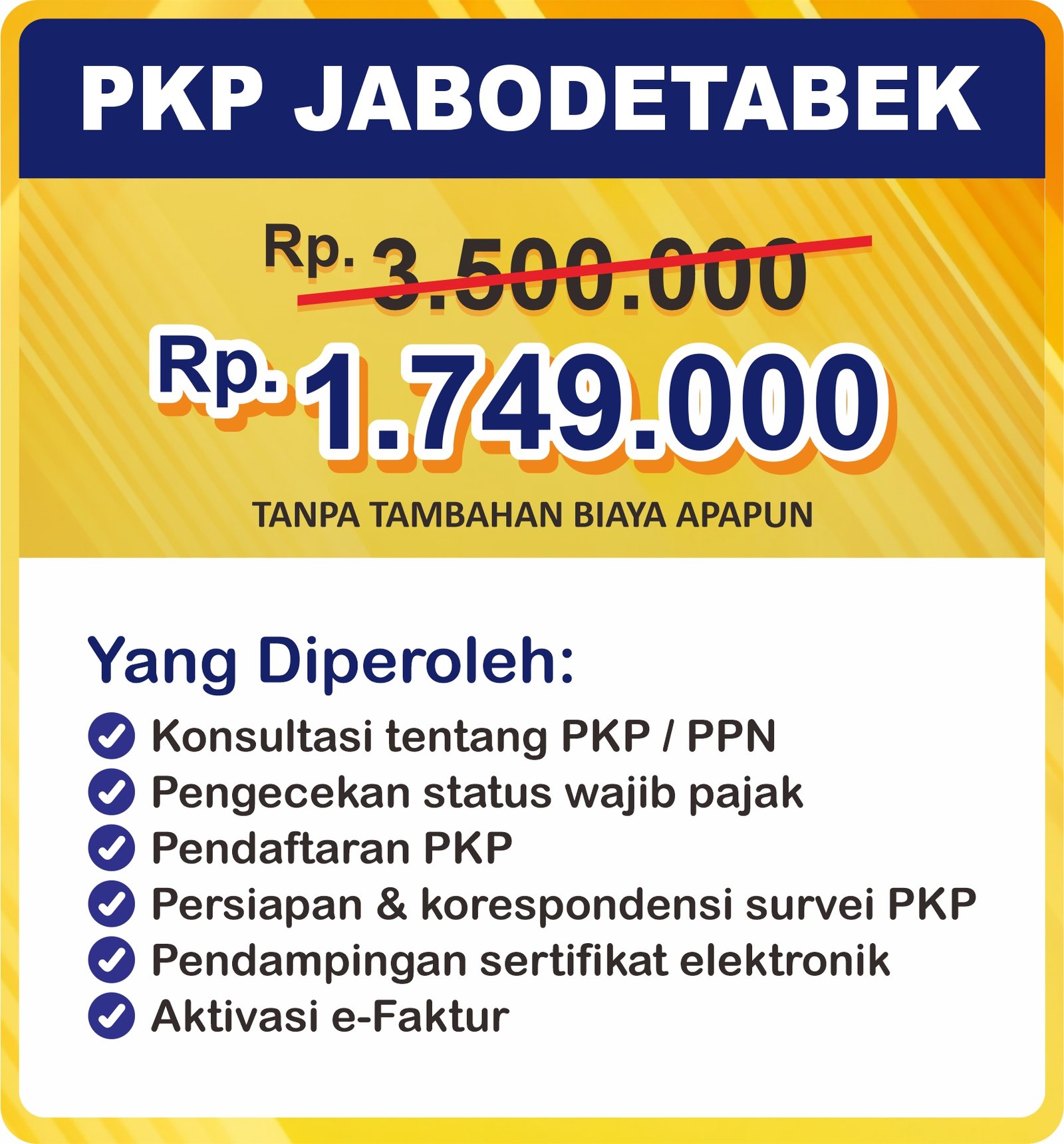 EasyLegal saat ini mengadakan Legal Festival Special Deal, sebagai bentuk dukungan untuk UMKM Indonesia. Dapatkan Diskon 25% untuk daftar PKP. Ambil segera kesempatan ini, kuota terbatas!