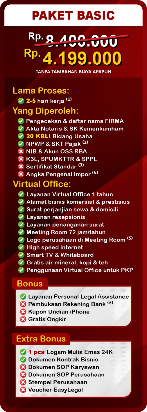 Note: ⁽¹⁾ Setelah tanda tangan Minuta Akta | ⁽²⁾ SKT Pajak dikirim oleh KPP dalam 1-3 bulan | ⁽³⁾ Resiko menengah rendah | ⁽⁴⁾ Opsional | ⁽⁵⁾ Saat penggunaan Meeting Room | ⁽*⁾ Syarat & Ketentuan Berlaku