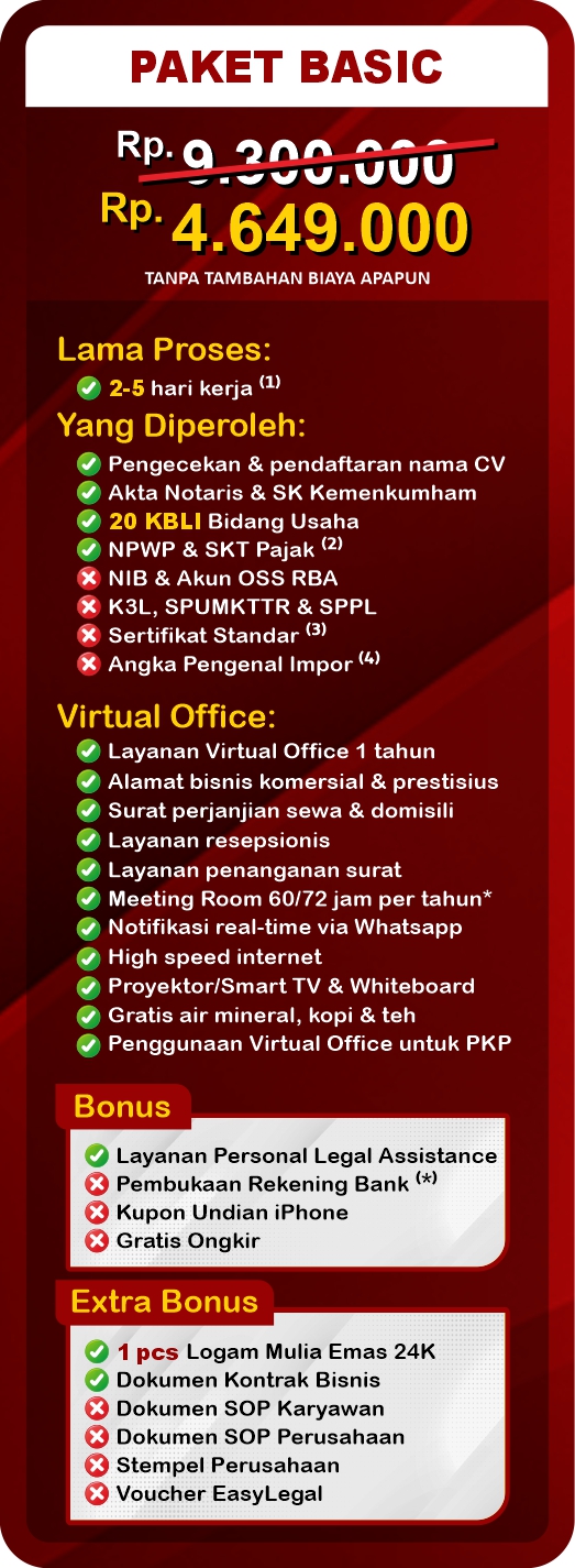 Note: ⁽¹⁾ Setelah tanda tangan Minuta Akta | ⁽²⁾ SKT Pajak dikirim oleh KPP dalam 1-3 bulan | ⁽³⁾ Resiko menengah rendah | ⁽⁴⁾ Opsional | ⁽⁵⁾ Saat penggunaan Meeting Room | ⁽*⁾ Syarat & Ketentuan Berlaku