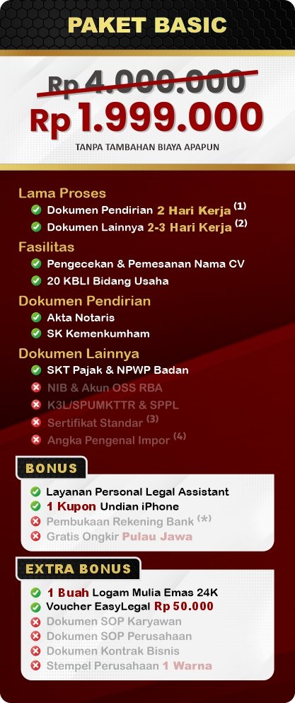 EasyLegal adalah solusi legalitas bisnis terintegrasi yang menyediakan layanan pendirian perusahaan, perizinan usaha, pendaftaran HAKI & layanan legalitas lainnya. EasyLegal menghadirkan layanan cepat, mudah & terjangkau untuk membantu pelaku bisnis menghemat waktu dalam pengurusan legalitas, memberikan kemudahan melalui layanan online & offline, serta menghemat biaya legalitas. Pelaku bisnis dapat fokus mengembangkan usaha tanpa perlu khawatir dengan urusan legalitas.