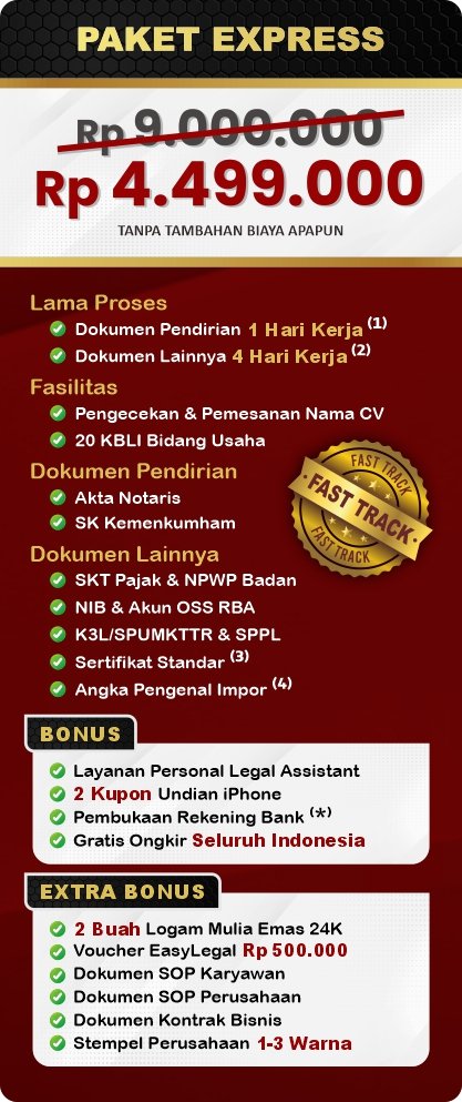 Pendirian CV di Indonesia dapat meningkatkan reputasi bisnis dan menawarkan kemudahan pengelolaan, sekaligus membuka peluang pertumbuhan. Ideal untuk usaha kecil hingga menengah, memungkinkan pengembangan usaha dengan pendekatan yang lebih dinamis dan responsif. EasyLegal sebagai jasa pendirian CV saat ini mengadakan Legal Festival Special Deal, sebagai bentuk dukungan untuk UMKM Indonesia.