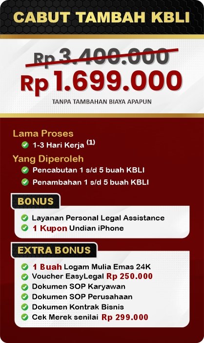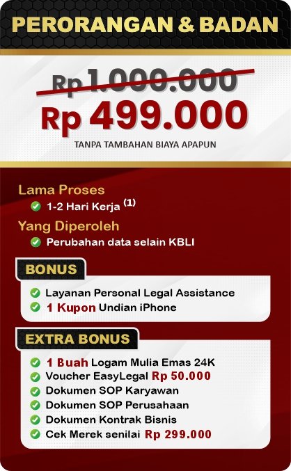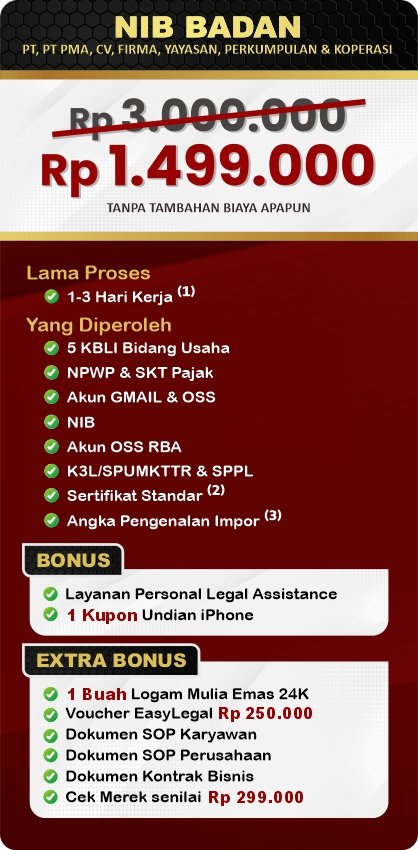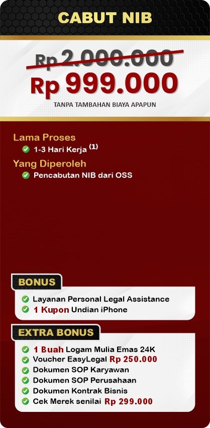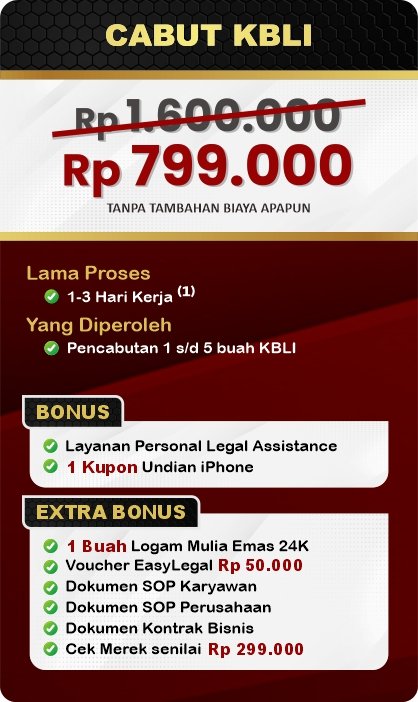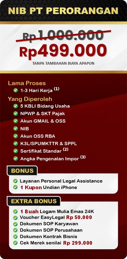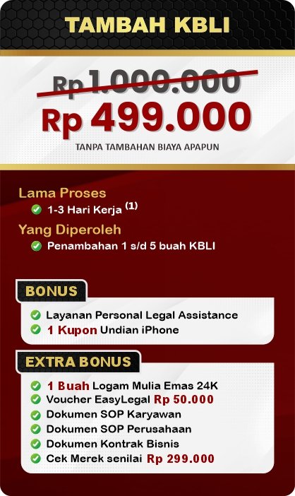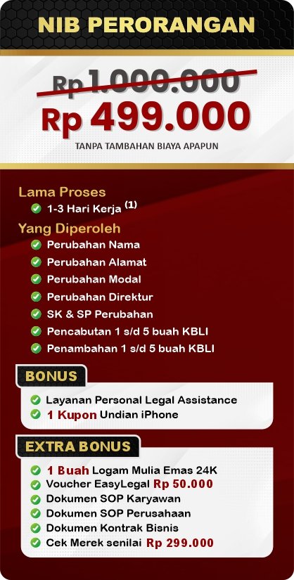 EasyLegal saat ini mengadakan Legal Festival Special Deal, sebagai bentuk dukungan untuk UMKM Indonesia. Dapatkan Diskon 50% untuk pembuatan NIB & OSS RBA. Ambil segera kesempatan ini, kuota terbatas!