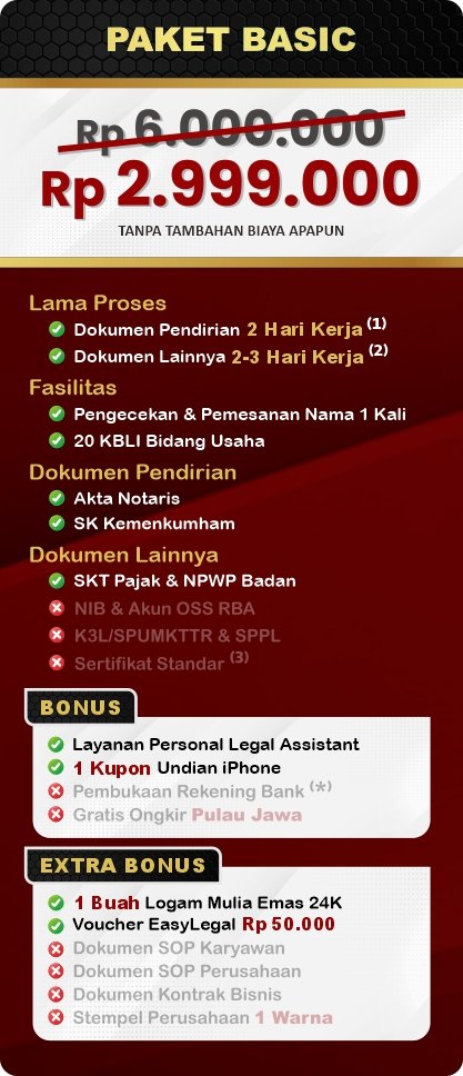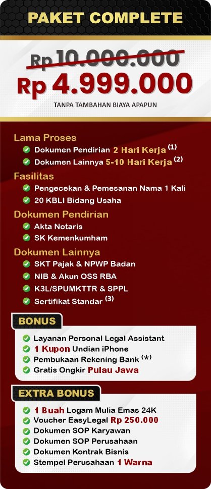 Oleh karena itu, kami ingin memberikan rasa AMAN dengan menawarkan layanan pendirian perusahaan, perizinan usaha dan pendaftaran HAKI melalui MARKETPLACE yang dapat memberikan JAMINAN KEAMANAN yang Anda butuhkan.
