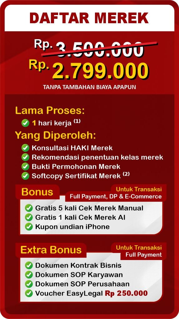 Mendaftarkan merek di Indonesia dapat melindungi hak kekayaan intelektual. Proses ini menjamin hak eksklusif atas merek & mencegah penggunaan merek tanpa izin. Penting bagi bisnis yang fokus pada pertumbuhan dan ekspansi pasar. EasyLegal sebagai jasa pendaftaran merek saat ini mengadakan Legal Festival Special Deal, sebagai bentuk dukungan untuk UMKM Indonesia.