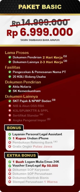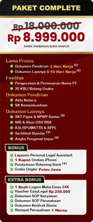Layanan: Jasa Pendirian PT | Jasa Pendirian PT PMA | Jasa Pendirian PT Perorangan | Jasa Pendirian CV | Jasa Pendirian Yayasan | Jasa Pendirian Perkumpulan | Jasa Pendaftaran Merek | Layanan perizinan usaha lainnya