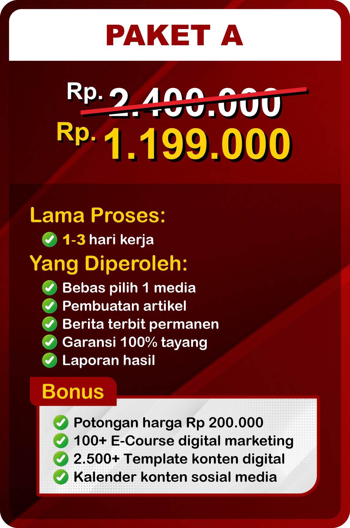 Waktu penerbitan berbeda-beda tergantung pada media dan paket yang dipilih. Kami menjamin publikasi maksimal dalam 7 hari setelah pembayaran diterima, dengan opsi pengembalian dana jika terjadi keterlambatan. Untuk media kecil atau advertorial, penerbitan maksimal 3 hari dengan opsi penyesuaian tanggal sesuai ketentuan.