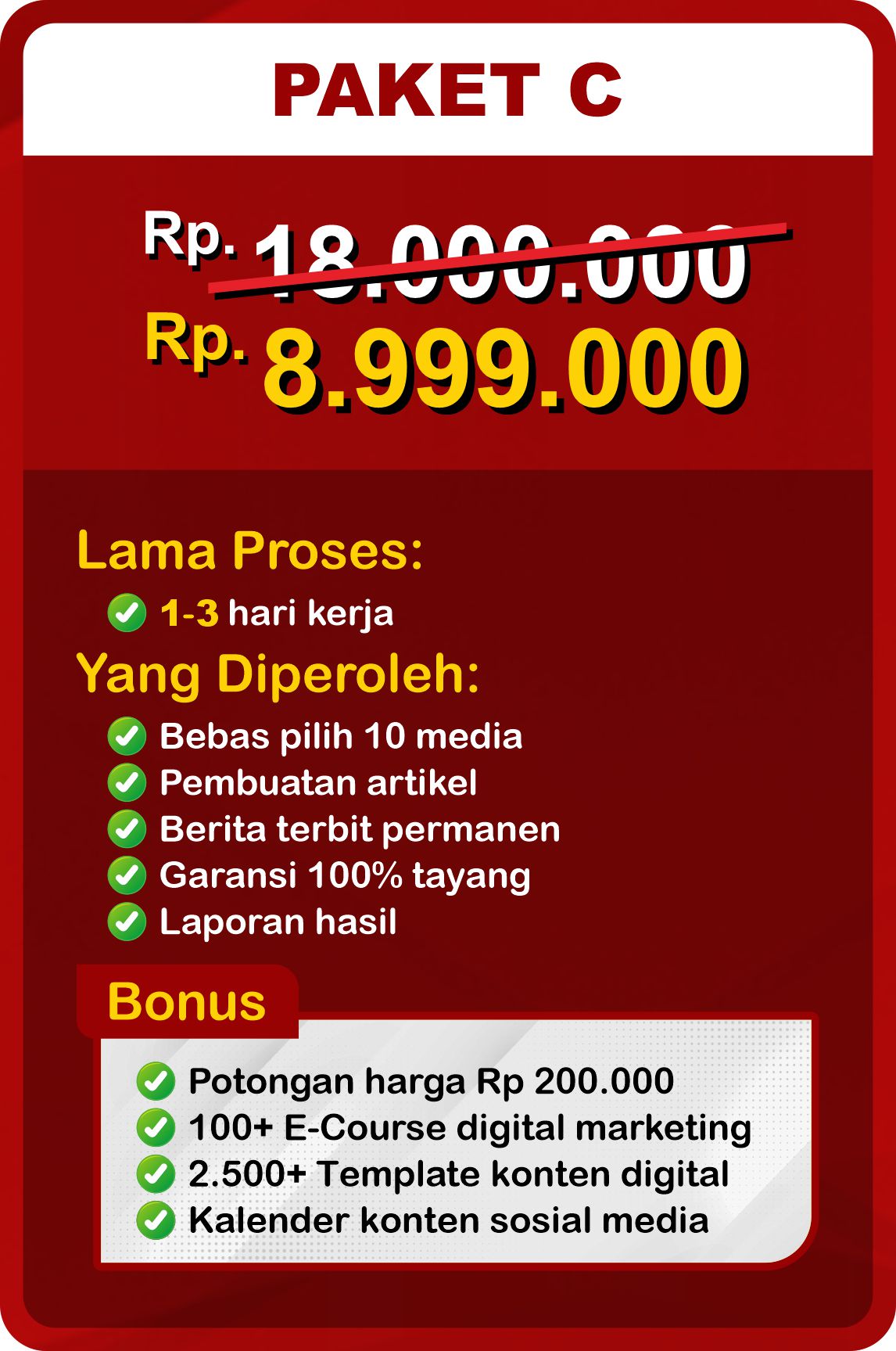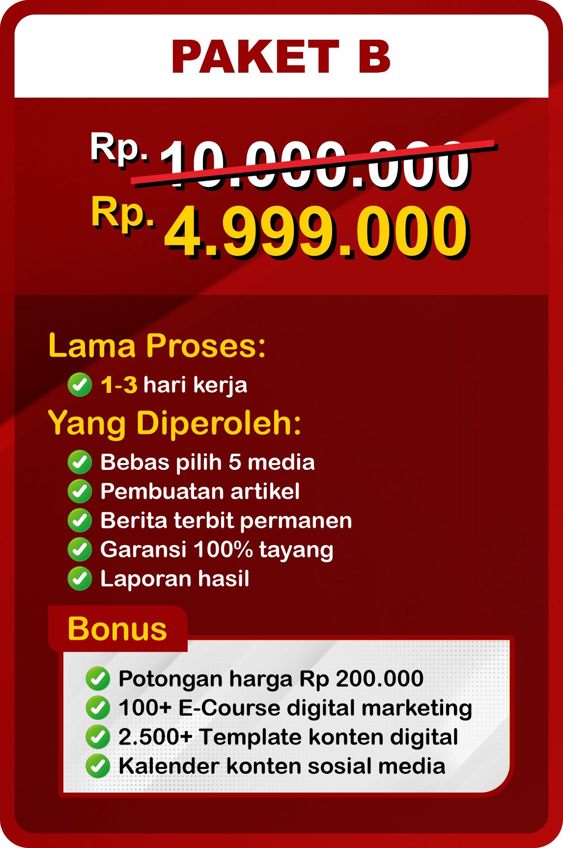 Kami menawarkan beberapa pilihan paket press release, masing-masing dengan jumlah media penerbitan yang beragam. Anda bisa memilih paket sesuai kebutuhan atau menentukan jumlah penerbitan sendiri. Untuk bantuan lebih lanjut, konsultasi gratis tersedia.