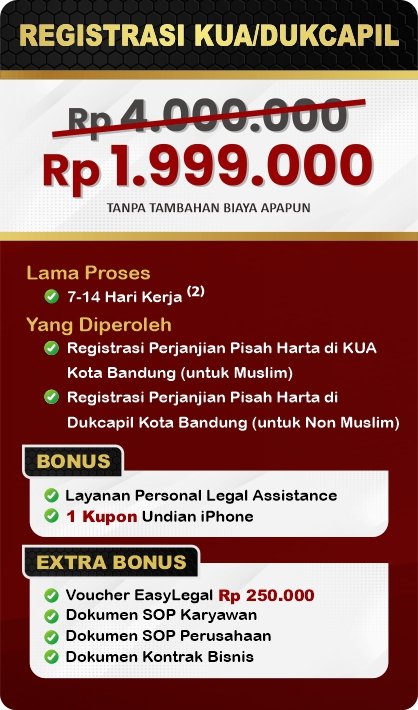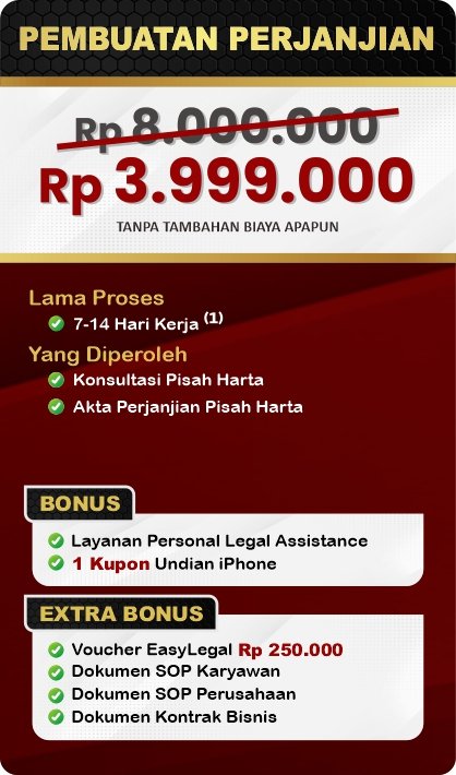 Dalam layanan ini kami hadirkan Legal Festival Special Deal untuk Perjanjian Perkawinan dengan diskon hingga 50%. Ambil segera kesempatan ini!